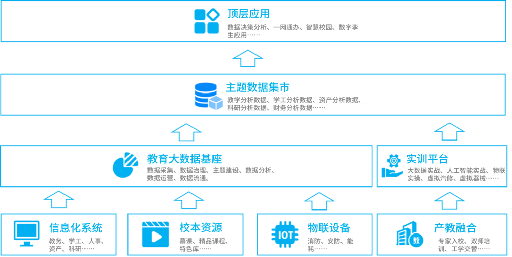 以数据为基础,通过中台建设完成梳理学校数据需求、数据来源、数据格式、数据维护、数据更新、数据共享、数据使用等关键问题,建立包括组织、制度、标准、流程、安全、技术等内容的数据资产管理长效机制。同时利用数据反哺业务,助力学校信息化建设高质量发展,助力学校智能化多维度发展。